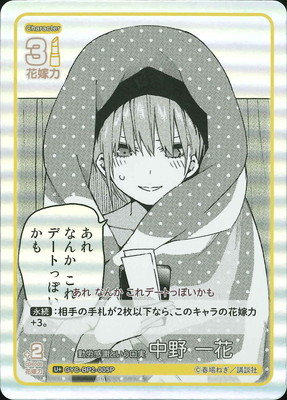 GYC-BP2-005P 勤労感謝という口実 中野 一花 勤労感謝という口実 中野 一花 キャラクター 中野 一花 カードタイプ キャラクター レアリティ U+ 収録商品 ブースターパック vol.2 かけがえのない存在 花嫁力 3 花嫁力(補正値) 2 台詞 あれ なんか これデートっぽいかも 永:相手の手札が2枚以下なら、このキャラの花嫁力+3。