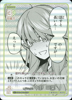 GYC-BP2-025P しどろもどろ 中野 四葉 しどろもどろ 中野 四葉 キャラクター 中野 四葉 カードタイプ キャラクター レアリティ U+ 収録商品 ブースターパック vol.2 かけがえのない存在 花嫁力 3 花嫁力(補正値) 2 台詞 話すと長いん… の… ですが… えっと… 永:このキャラが変装しているなら、お互いの花嫁とキャラ1人につき、このキャラの花嫁力+1。