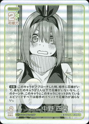 GYC-BP2-026P 見えた光明 中野 四葉 見えた光明 中野 四葉 キャラクター 中野 四葉 カードタイプ キャラクター レアリティ U+ 収録商品 ブースターパック vol.2 かけがえのない存在 花嫁力 2 花嫁力(補正値) 2 自:このキャラがアプローチした時、相手に花嫁がいて、あなたのキャラが2人以下で花嫁がいないなら、このターン中、このキャラとこのキャラにセットされているエピソードすべては相手のイベントで花嫁力が減らない。
