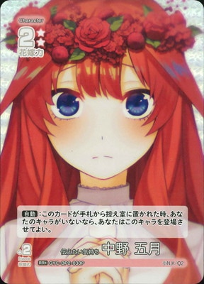 GYC-BP2-030P 伝えたい気持ち 中野 五月 伝えたい気持ち 中野 五月 キャラクター 中野 五月 カードタイプ キャラクター レアリティ RR+ 収録商品 ブースターパック vol.2 かけがえのない存在 花嫁力 2 花嫁力(補正値) 2 自:このカードが手札から控え室に置かれた時、あなたのキャラがいないなら、あなたはこのキャラを登場させてよい。