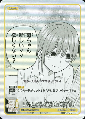GYC-BP2-039P いつでも演技は真剣! いつでも演技は真剣! キャラクター 中野 一花 カードタイプ エピソード レアリティ U+ 収録商品 ブースターパック vol.2 かけがえのない存在 花嫁力(補正値) 3 台詞 菊ちゃん新しいママ欲しくない? 専用:一花 自:このカードがセットされた時、各プレイヤーは1枚引く。