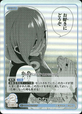 GYC-BP2-052P 嘘のない感情 嘘のない感情 キャラクター 中野 三玖 カードタイプ エピソード レアリティ U+ 収録商品 ブースターパック vol.2 かけがえのない存在 花嫁力(補正値) 2 台詞 お好きにどうぞ 負けないから 専用:三玖 自同名ターン1:セットされていたこのカードが控え室に置かれた時、このカードを手札に戻してよい。 (花嫁になった時も戻せる)