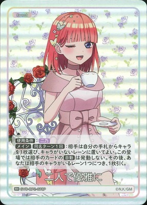 GYC-BP2-073P 二人で優雅に 二人で優雅に キャラクター 中野 二乃 カードタイプ イベント レアリティ R+ 収録商品 ブースターパック vol.2 かけがえのない存在 使用条件:二乃 メイン同名ターン1:相手は自分の手札からキャラを1枚選び、キャラがいないレーンに置いてよい。この登場では相手のカードの自は発動しない。その後、あなたは相手のキャラがいるレーン1つにつき、1枚引く。